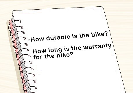 Make a list of questions to ask about the dirt bike in advance. If you're buying at a dealership, the salesperson there should be an expert on the bikes in store and should be able to provide answers to all the questions you have. A used bike seller is more than likely not an expert and they will only be able to answer some of your questions about their dirt bike. Good questions to ask are: "How durable is the bike?" This will tell you how well the bike stands up to force and pressure. "How long is the warranty for the bike?" A dealership will provide you with a warranty but don't expect one from a seller from eBay or Craigslist. "How many CCs is the dirt bike?" Cubic centimeters (CC) tells you how big the engine is. "How often does the bike need to be serviced?" All vehicles should be given a look over at a garage from time to time. If the bike needs to be serviced more than once a year, it's probably going to be high maintenance for the rest of the time too.
