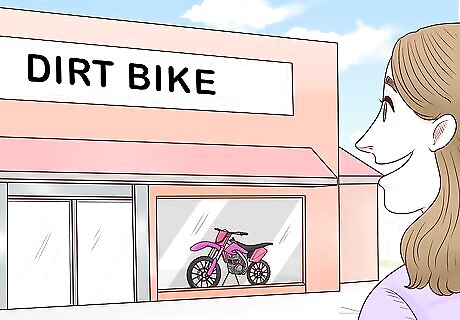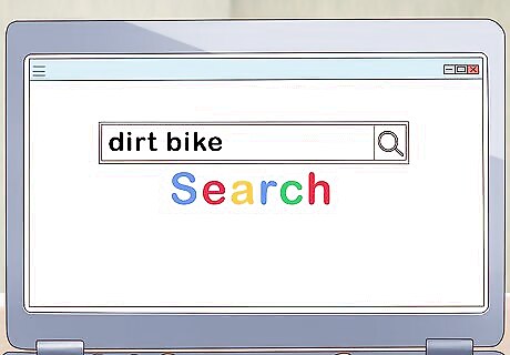 Look for play dirt bikes since they're designed for beginners. Dirt bikes come in a variety of types and sizes. Since you're only starting out, a play bike will be ideal as your first dirt bike. Don't be offended by the word "play" here. If you've never owned or rode a dirt bike before, it's a bad idea to start out with one of the fastest bikes on the market. Play bikes are designed for beginners. Play bikes are high on durability and low on maintenance, which means they are perfect for beginners. You'll be able to focus on learning how to ride and control the bike. If you have some experience riding dirt bikes and don't want to buy a play dirt bike, you can buy another type of bike. Trail bikes are the most common type of dirt bike. These bikes are designed for riding on rough terrain. Motocross bikes are built for speed, endurance dirt bikes are made to travel long distances, and street bikes can be driven on roads or on rough terrain.