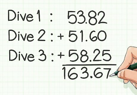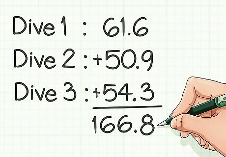 Add final scores as the event continues. Calculate each dive's final score using the same system. To determine an athlete's score for the whole event, add the final score for each dive. Example: If a diver dives three times with scores of 61.6, 50.9, and 54.3, the diver's score for the event is 61.6+50.9+54.3=166.8.
