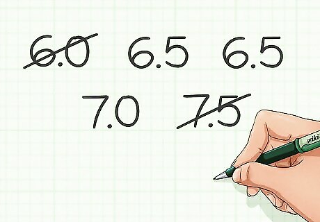 Cross out the outliers. This step depends on how many judges there are: Seven judges: Cross out the two highest and the two lowest scores. Five judges: Cross out the highest and lowest scores. Three judges: Use all three scores. Example: There were seven judges, so cross out two scores on each end: 6.5, 7.0, 7.0, 7.5, 7.5, 8.0, and 8.0.