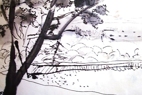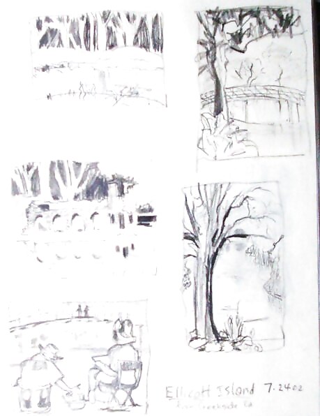 Jot down, in words, your impressions. Lose the fear of a blank page by describing the scene in words, record your impressions. You could list the specifics of your situation at that moment; your location, weather, wind, temperature, etc. Just start making marks on the paper. Whatever it takes to help you open the eye-to-hand connection and get those lines flowing.