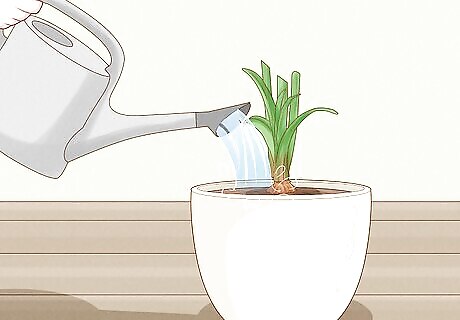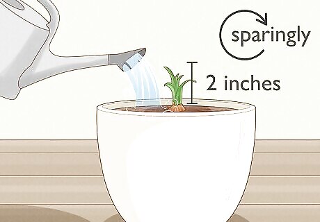 Water the bulb very sparingly until it reaches 2 inches (5 cm) of new growth.