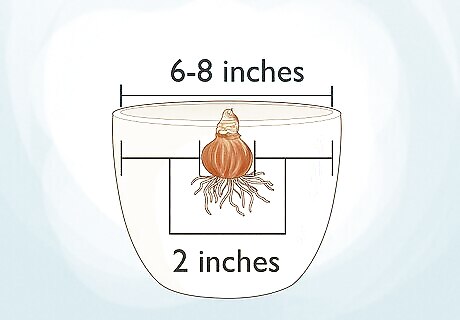 Pick a container that is half as wide as the bulb on each side. There should be able 2 inches of soil between the side of the bulb and the pot. Most amaryllis bulbs prefer a sturdy 6 to 8 inch pot.