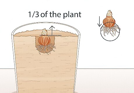 Place the amaryllis bulb in the pot with the roots down. Gently fill in potting soil around the bulb. Leave the stem of the bulb, approximately 1/3 of the plant, above the soil. Don’t pack the soil in too much, since you want the roots to remain intact. If you worry that planting them with the stem above the soil in a garden may force them to fall over, place a planting stake next to the bulb to keep it upright.
