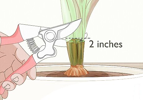 Cut the leaves back to 2 inches above the bulb. When they start to yellow because of cooler temperatures and less water, they are ready to cut.