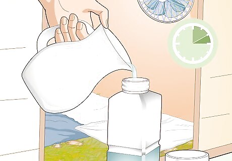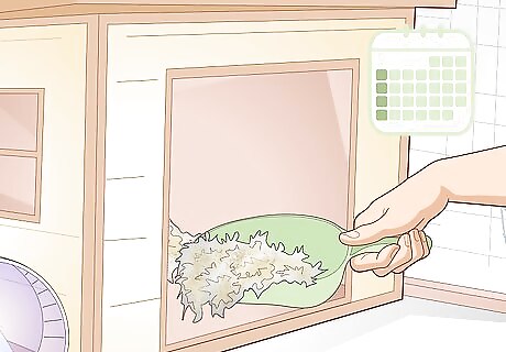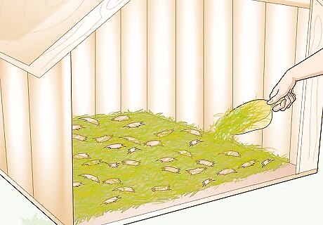 Clean your guinea pigs cage at least once a week. The advantages of keeping your guinea pigs outdoors, is that they have access to the lawn. This means you have to clean them less, as less bedding is used. However, their bedding inside the hutch will still require weekly cleaning, and daily spot cleaning to prevent the bedding from soiling. #*Empty the contents of the cage and sweep up once a week. Scrub down the floors and walls of the hutch with a cleaning detergent, and wash up their bowls and water bottles in a clean sink. Additionally, move the hutch around the garden to give your guinea pigs access to fresh grass.
