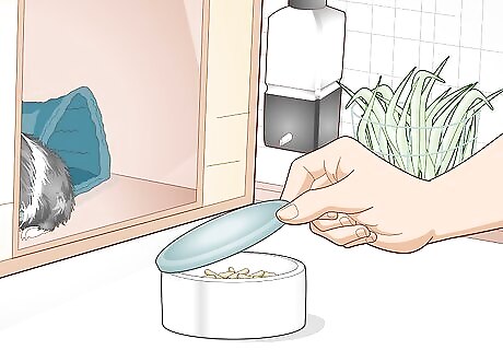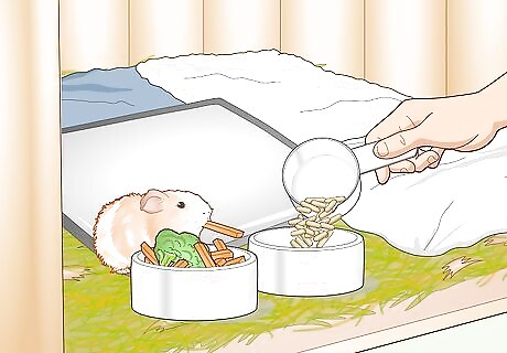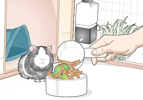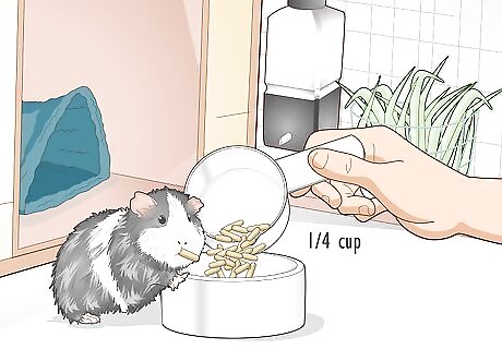 Give your guinea pigs 1/4 cup of oxbow pellets each morning. When picking your brand of pellets, choose a plain pellet brand. Avoid guinea pig feed that contains colourful contents or dried fruit, as these aren't healthy. Pellets are important to provide your guinea pig with vitamin C, as they cannot produce it on their own.