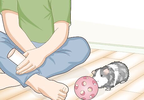 Bring your guinea pig's indoors for floor time. Allow your guinea pigs 1-2 hours of floor time each day. This will allow you and your guinea pig to bond with each other, and provide them with some exercise and mental stimulation. Set up a puppy play pen inside a quiet room in your household, and place some hides and toys around the floor. Additionally scatter some vegetables and hay on the floor, and encourage your guinea pig to explore.
