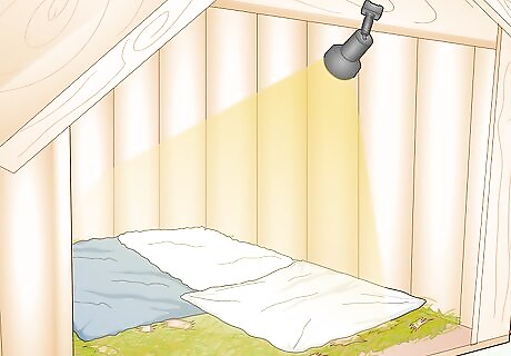 Attach a heating lamp to the roof of the hutch. Heating lamps can be purchased from farm supply stores, and are commonly used by poultry farmers to keep chickens and ducks warm during winter. They can also be used to keep your guinea pig warm. Ensure to research the risks of heating lamps, as they can easily over-heat your guinea pig, or cause discomfort. They can even burn if your guinea pig comes into contact with the bulb. A good, reliable brand is recommended, and only install if the hutch is big enough.