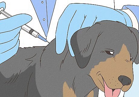 Get your dog vaccinated. In terms of routine healthcare, your puppy will need vaccinating against various canine infectious diseases. Exactly which diseases depends on which infections are prevalent in your area. Your veterinarian should advise you about what vaccinations your dog should get. Possible vaccinations that your vet may suggest include: distemper, parvovirus, canine adenovirus, leptospirosis, infectious canine hepatitis, parainfluenza virus, and Lyme disease. In addition, a vaccination against rabies is obligatory in many states and you will be breaking the law not to comply. Different vaccines are given at different ages. Typically the rabies vaccine is given as a single dose after 12 weeks of age, repeated every 1 to 3 years (depending on the manufacturer) or if given earlier (some brands can be given from 4 weeks of age,) a second dose must be given at or after 12 weeks of age. Many other vaccines are given in three doses, 3 - 4 weeks apart, with the final dose always falling around 16 weeks of age. This is so the puppy receives protection from the vaccine at a young age, but not so early that it doesn't benefit from the antibodies provided by its mother. Your Doberman should receive yearly booster injections according to the protocol advised by your vet. The vet will select those diseases with are common in the area (core) and those less common (non-core) and discuss which are most appropriate for your dog.