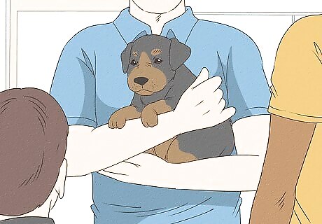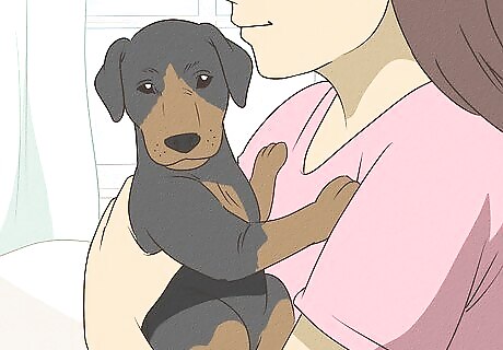 Be aware how important socialization is. A good breeder will make sure to socialize his or her dogs in order to guarantee they grow into confident well-adjusted adult dogs. This is especially important for the Doberman, who can be prone to anxiety or territorial behavior. Proper socialization as a puppy helps make the youngster accepting of strangers, rather than suspicious of them. This makes it less anxious and therefore better adjusted to life with people. The breeder should make efforts for as many different people as possible to meet the puppies from around 3 - 4 weeks of age, so the young dogs are used to people of different heights, appearances, and tones of voice. The puppies should not be exclusively reared in a kennel as this isolates them from the normal sights, sounds, and activities of a domestic house, and they will find it more difficult to adjust to family life.