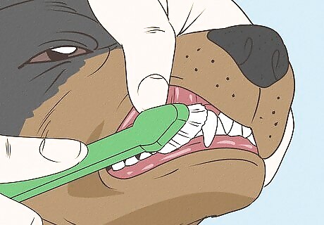 Take care of your dog's teeth. Get in the habit of regular tooth brushing. Use a special dog toothbrush or a finger mitt and dog toothpaste. To get your dog used to the process, wet the brush with water and gently rub it on the outer surfaces of the teeth. Once the dog is happy with this, you can introduce a blob of dog toothpaste onto the brush. These pastes are tasty to dogs, don't need rinsing, and are free from substances harmful to dogs if swallowed, such as fluoride.