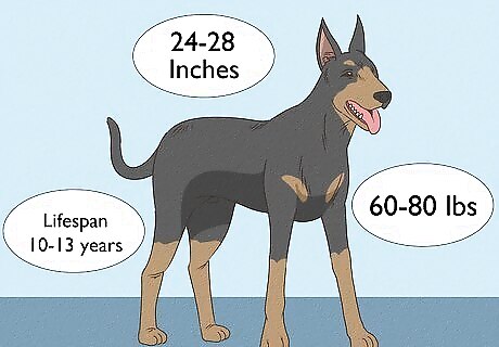 Understand what a full-grown Doberman will look like. The Doberman should stand around 24 - 28 inches tall at the shoulders, with males being taller than females. The classic color is black with tan markings, but red, blue, and fawn are also permissible by the AKC. The Doberman weighs 60 - 80 lbs and the average lifespan is 10 - 13 years. In the US the ears are usually cropped, while in the UK this procedure is considered a cosmetic mutilation and frowned upon.