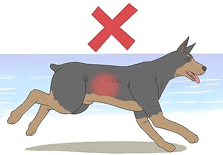 Never exercise your dog immediately after eating. Wait for at least 90 minutes after feeding your dog before exercising it. Exercising too quickly could cause the dog's stomach to flip over and becoming twisted. This is a life-threatening condition called bloat. Signs of bloat include non-productive retching and restlessness or agitation. If your dog is trying to throw up but bringing nothing up, take it to the vet immediately. Feeding from an elevated bowl is also said to increase the chances of bloat, so place the dog's food bowls on the floor. Eating quickly and gulping down food makes the dog likely to swallow air. If the dog is greedy consider strategies to slow its eating. You can purchase commercial slow-feeders, or consider putting large rocks (be sure they are too big to swallow) in the feeding bowl so the dog has to eat around them, slowing it down.