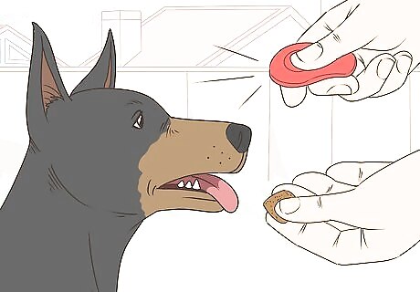 Use a positive-reinforcement training method. Dobermans respond well to clicker training. The idea of this training method is to have the dog associate the click-clack sound of the clicker with a reward. The clicker is used to mark the exact moment the dog shows a desired behavior, so that it understands that is what you want it to do and it will earn a reward for repeating the behavior.