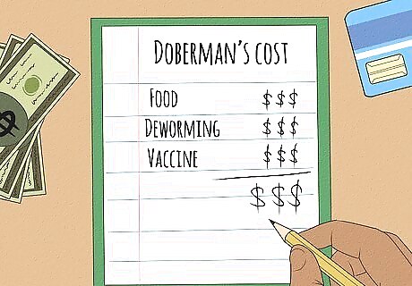 Calculate the cost of owning a Doberman. You should weigh the costs associated with keeping any large dog. You need to provide a good quality food, since cheap foods bulked up with cereal may ferment in the dog's gut and predispose it to bloat. Obviously good quality foods are more expensive than that cheap food, and the cost of feeding the required amount can be considered. Also, deworming and anti-parasite treatments are going to cost more than for a small dog.