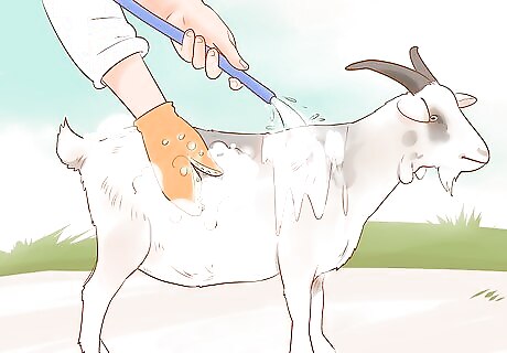 Bathe your goats only if they get parasites. Most of the time, brushing will be sufficient for your goat. To bathe the goat, slightly warm up the water so it's not cold. Lather the goat up with a shampoo meant for animals or specifically for goats. Use a washing mitt to help along the process. Rinse off the soap. It makes it easier if your goat has a collar on because it is easier for you to hold on to her.