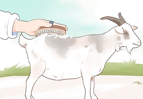 Brush your goat once a day. Use a sturdier brush to get rid of the more obvious dirt on your goat. Next, use a soft brush (curry comb) to comb through your goat's hair. Also, feel for bumps on your goat as you brush, as those could indicate infections or a cut or scratch. Your goat will not likely need clipping unless you plan to show her.