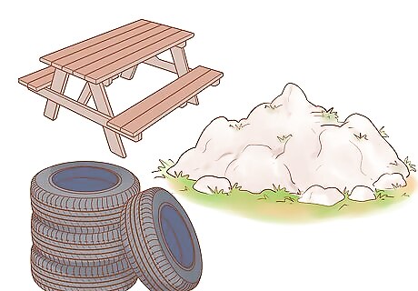Include climbing areas. Goats love to climb, so you'll need to include some places for them to do so. For instance, any kind of picnic table is ideal for this pastime. You can even just create hills out of dirt, as goats will find that just as enjoyable. They also like to jump on and off these places. Old tires also make good toys for your pets.