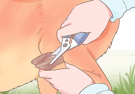 Trim your goats' hooves. Your goats hooves will grow over time, and if they aren't trimmed, you could end up with goats who can't walk well. To trim them, use gloves, hoof shears, and a hoof knife. Tie or hold the goat. You will need to have someone hold the goat in place while you trim its hooves. Look for the growth rings. You should be able to see where the hooves have grown. Trim back the hooves until they are even with the last growth ring.