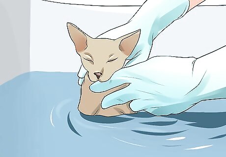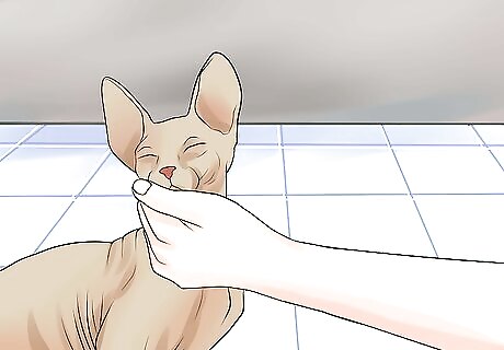 Bathe your cat regularly. Sphynx cats need regular bathing to keep their skin in good condition. Because of the lack of hair, the Sphynx’s body secretes oil. This causes the breed to need frequent bathing. You should bathe your cat once a week. Sphynx cats are a great breed for people who are allergic to cats and cat hair. By bathing, your cat often, it also washes away dander and helps to keep the allergic component down. Sphynx cats have different degrees of hairlessness. Some Sphynx cats are completely hairless with skin that feels like a warm chamois leather. Some Sphynx cats have downy hair over their body, which feels like warm peach fuzz. The skin itself is often "oversized" for the body and sits in wrinkles. These wrinkles can be pronounced over the forehead and give the cat a quizzical or worried expression.