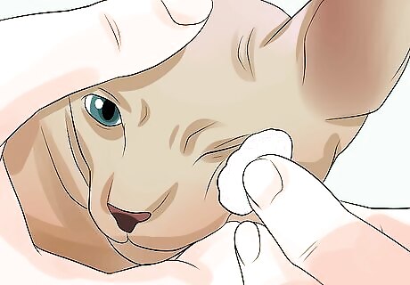 Clean your cat’s eyes. Sphynx cats don’t have eyelashes. This means that the eyes can get dirt and other build up around them, which can cause irritation. To clean your cat’s eyes, gently wipe them with a damp tissue. Don’t use anything containing alcohol or other irritants, like baby wipes, around your cat’s eyes. It will cause more irritation.