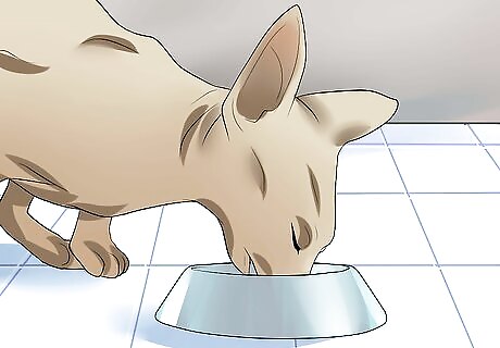 Feed your Sphynx cat often. The Sphynx cat lacks the insulating fur of other cat breeds, and therefore loses body heat more easily. The breed has a very high metabolism, which means your Sphynx cat needs to eat more than another cat might. You should always have dry food down for your cat to eat if you feed your cat dry food. If you feed your cat canned food, feed him three times a day or as needed to keep him satisfied. If feeding your cat wet, canned food, try for an average of eight to 12 ounces of food per day. You do not want your cat to be overweight, but your Sphynx cat should never be bony. If his weight decreases, or his ribs become more obvious, then increase the ration by five to 10%. Reweigh him again a week later to check the weight loss has been arrested. Alternatively, look for a food that is marketed for active cats, or look for a breed-specific food made for Sphynx cats. These tend to be higher calorie than the equivalent amount of regular food. Feed your Sphynx cat a good quality, protein rich food. Meat should be listed first and second on the pet food label. Avoid foods where a large percentage is cereal based.