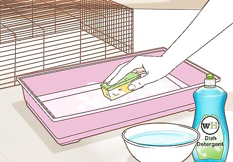 Keep your hamster's cage clean. Hamster cages should be cleaned out completely every week to 2-3 weeks, depending on your hamster and needs. They should also be "spot cleaned," by removing fresh foods and cleaning toilet areas, each day, depending on the size and type of cage. To clean the cage, take the top off and empty all the dirty bedding and wood shavings and old food into a dustbin. Scrape out all the other remains. Go over the cage with a pet-made disinfectant, then dry it with tissues or kitchen roll, if preferred. Wash out bowls and water bottle (or bowl) at the same time as cleaning the cage. Dust and rinse all items of the cage. Dry everything and fill the cage with fresh wood shavings, bedding, food, and water. Put all the items back in the cage and clip the top back on. A clean cage makes your Syrian hamster happy and healthy. Try giving your hamster a "hamster toilet," which is a plastic litter pan with a hood that fits snugly into the corner of the cage. Use the special hamster litter which you can purchase from pet stores, and clean the toilet every other day. Hamsters generally catch on quickly as to what the hamster toilet area is for, since instinct tells them to use one corner for toileting, and the confines of the toilet help them to feel secure.