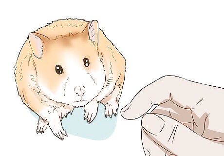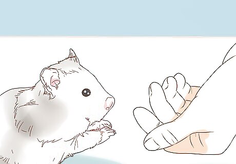 Give your hamster time to get used to you before attempting to pick it up. Have short, non-aggressive interactions with the hamster several times a day until your pet is comfortable with you. Once the hamster accepts you stroking it, try scooping it gently into the palm of your hand. This may take a long time with aggressive females, but tame, friendly males will allow you to hold them after just a few days. The ideal time to wait before picking up your hamster and taking it out of the cage to play is two to three weeks. To hold your hamster, slide one hand under it and cup the other round the front of its body. Ensure you are gentle. You should never start by picking your hamster up! Try holding out treats for it. If the hamster is too shy to take it from your hands, just put the treat down and wait for the hamster to take it.