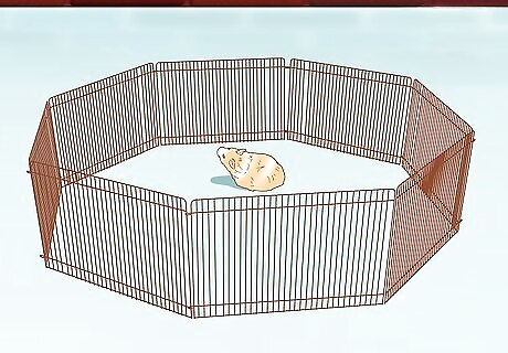 Relocate the hamster while you clean its cage. Disinfect the cage properly and change the bedding before putting your hamster back in. While you clean the cage, you can put your pet in a play pen have someone supervise it. Hamster balls are terrible for hamsters. While some might look like they are enjoying it, they are probably stressed and trying to find a way to get out of it by running around. If a hamster gets thirsty or hungry it would also not be able to tell you, which could be very bad for your small pet. Put the hamster in a pen, supervised, so it cannot escape. Cleaning the cage too often can cause stress; this does not mean do not clean your cage, rather, just clean it every other week and remember spot cleaning is your best friend.