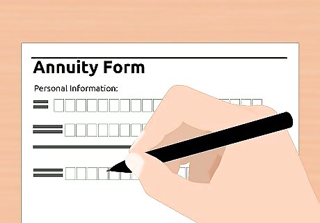 Purchase an annuity. When you are ready, you can purchase an annuity by sitting down with the insurance company you feel most comfortable with. When you meet with the insurance company, you will need to bring various form of identification and you will need to fill out a number of forms. The type and number of forms will depend on where you purchase the annuity. Be aware that the purchase of an annuity will usually include a substantial up-front cost. For example, if you buy an immediate annuity through Prudential, the minimum investment amount is $10,000.