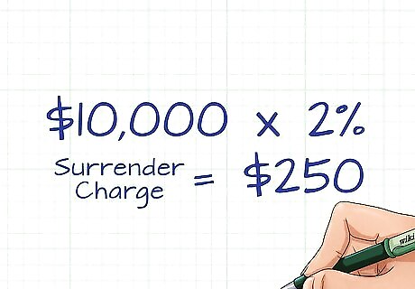 Calculate your liability. Before you surrender your annuity, understand what you will owe the insurance company in surrender charges. For example, assume you have an immediate annuity with a current value of $10,000. The contract includes a surrender charge of 7% over seven years (decreasing 1% annually until it reaches zero). You surrender the annuity in your sixth year. You will owe a 2% surrender charge to the insurance company. In total, you would have to pay $200 just to cancel the annuity contract. In another example, assume you have an immediate annuity with a current value of $250,000. The contract includes a surrender charge of 6% over six years (decreasing 1% annually until it reaches zero). You surrender your annuity in your first year. You will owe a 6% surrender charge to the insurance company. In total, you would have to pay $15,000 just to cancel the annuity contract. In another example, assume you have an immediate annuity with a current value of $30,000. The contract includes a surrender charge of 10% over ten years (decreasing 1% annually until it reaches zero). You surrender your annuity in your thirteenth year. You would not owe the insurance company any surrender charge.