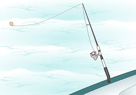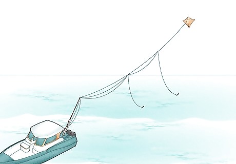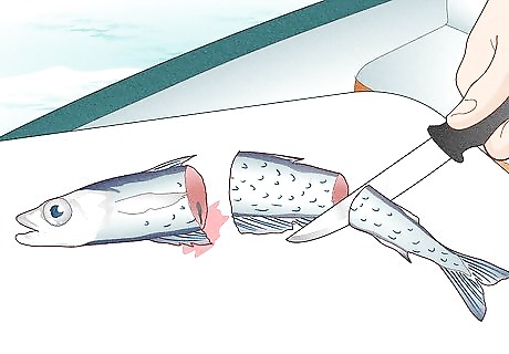 Hook live bait, like whiting or herring, through the nose. Place your bait at various depths to create an attractive setup, setting out the shallowest lines first and the deepest lines last so that the lines don't become tangled.