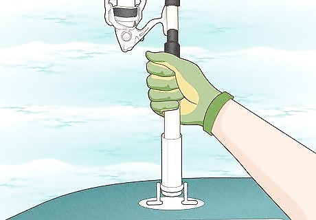 Have other people wind up the other lines and store the rods. The rods can be stored in the cabin or in the opposite gunwale from the hooked line.