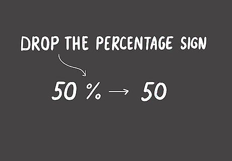 Drop the percentage sign. Before you can move the decimal point, you need to drop the percentage sign. For 50%, simply drop the % and write “50” on your paper. You may have a percentage like 20.5%, where there is a decimal point in your percentage. That's fine! It works the same as a whole number percentage like 20% when you convert it.