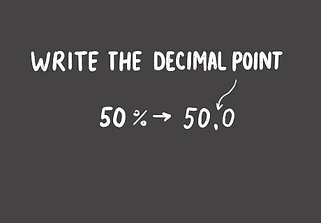 Write the decimal point into your number. Before you can move the decimal point, you need to know where it is. The decimal point comes at the end of a whole number, after the digit in the ones place. If you began with 50%, you will now have “50.0” on your paper.