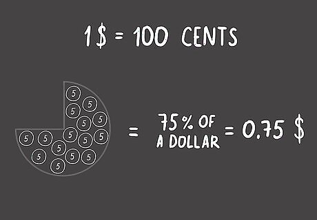 Relate this to a familiar example like money. Money is a helpful way to think about percentages and decimals because there are 100 cents (or pennies) in a dollar. If you have 75% of a dollar, then you are really saying that you have 75 cents out of a possible 100 cents, which is written like: $0.75. A percentage is a number written with a percentage symbol (%) after it. When you talk about a percentage, you are really saying “per 100.”