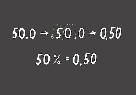 Move the decimal to the left by two. Finish converting your percentage to a decimal by moving the decimal point over to the left by two. When you write your answer, include one zero on the left side of the decimal point as a place holder. For example, if your starting value is 50%, you simply drop the percentage symbol. Next, note that the decimal point is to the right of the "0." Finally, move the decimal point two spots over so it is to the left of the "5." Together, all of the steps look like: 50%, 50, 50.0, 0.50.
