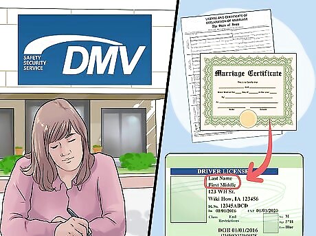 Update your driver's license at the Bureau of Motor Vehicles (BMV). You must change your name in person at a BMV office within 30 of changing your name. After paying the $5 fee, you'll need to show a document that proves your name change, like your marriage certificate or updated Social Security Card.