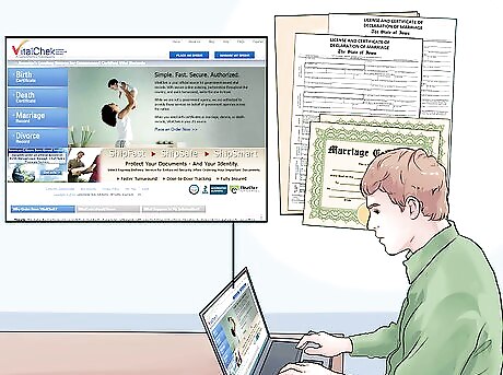 Get replacement copies of your marriage license. 1 certified copy costs $6 and each additional copy is $6. If you need a replacement certified copy, you have several ways to purchase them. If you'd like to get it in person, go to the Vital Records Office at 220 Capitol St. in Augusta, ME. You'll need to pay by cash or check. You could also mail your request to their office, including a check or money order, copy of your photo ID, and a long, self-addressed, stamped envelope. If you'd like to order them online, you can purchase them from an independent company that has partnered with the state: VitalChek Network. You can order certified copies of your marriage license through their website or by phone at 1-877-523-2659. The certified copy costs $15 for the first, plus a $13 processing fee, and shipping depending on your address.