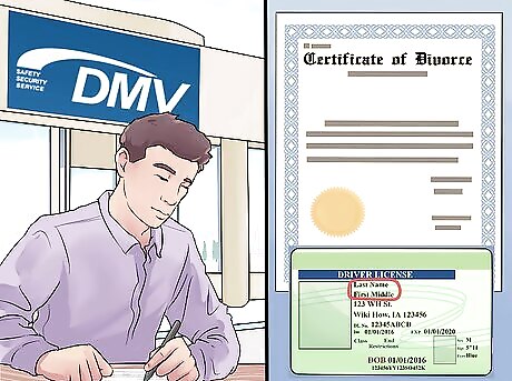 Update your driver's license at the Bureau of Motor Vehicles (BMV). You must change your name in person at a BMV office within 30 of changing your name. After paying the $5 fee, you'll need to show a document that proves your name change, like your divorce decree or court order.