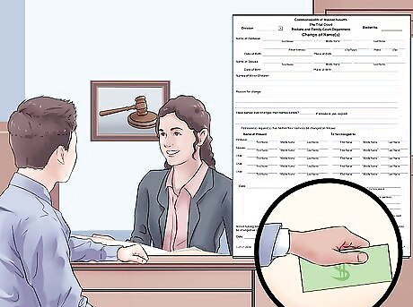 File the petition and pay the fees. The forms and fees can be filed and paid in person or mailed to the court, depending on what is most convenient for you. Your name change petition should be filed to a Family and Probate Court in the county where you live. You can visit mass.gov to find a listing of Family and Probate Courts based on county to find the correct court. Local courts differ on the types of payments (cash, credit, debit, etc.) that they accept. It's best to call your court during operating hours to find out about accepted payment methods. Fees include a $150 filing fee, a $15 surcharge, a $15 fee for citation (notification) if required, and $100 filing fee if you're motioning to change your name during a divorce. If you cannot afford fees, you need to qualify under the federal poverty income guidelines and file an Affidavit of Indigency, which will explains your financial situation to the court so they can decide whether or not you can pay your own fees.