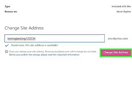 Type a new blog name into the "Change Site Address" field. It's toward the bottom of the right panel. The part of your address you can change is the part that comes before .wordpress.com. Blog addresses must be between 4 and 50 characters long and can only contain letters and numbers. If you type a new name that's already being used by someone else, you'll see a message that says "Sorry, that site has already been used!" If your heart is set on that address, try a creative spelling (e.g., removing the vowels, replacing letters with numbers) or tack another word to its beginning or end.