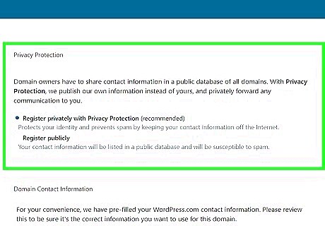 Select a privacy option. You can choose to register your domain publicly or privately. Public registration will make your name and address available to anyone who looks up info on your domain. Private registration hides that info. Unless this domain is for your business, it's a good idea to choose the private option.