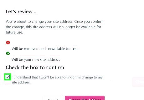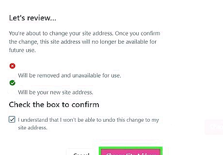 Click Change Site Address. It's at the bottom-right corner of the form. A pop-up window containing details about the change will appear. Once you change your address, your former address will no longer work. This means that anyone who had your old web address won't be able to find your new site until you've let them know. Blog addresses cannot be recycled. This means that you won't be able to switch back to your old address after changing it.