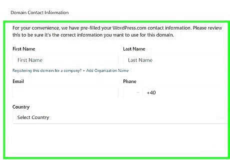 Fill out the registration form. You'll enter your name, business name (if applicable), email address, and other info here. If you chose a public registration, this info will be publicly available. If not, it'll only be visible to the domain registrar.