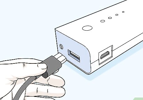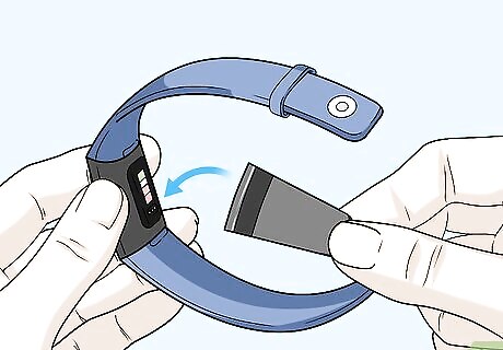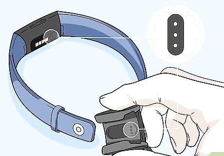 Line up the pins in the charger to the pins on the back of the Fitbit. To make sure you don't set the Fitbit incorrectly inside the charger, you'll want to see which way the pins are located in the charger's cradle and match them to the Fitbit's charging pins. The open side of the cradle should line up with the button on the Fitbit.
