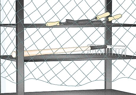 Protect your kids from your lawn and garden equipment. If you have lawnmowers, shovels, rakes, pitchforks or other garden tools, you need to store them carefully. Avoid throwing all of your garden tools into one corner of the garage. Make or purchase a garage rack to store your garden equipment. You can purchase a garage storage rack for rakes and shovels from your local hardware store. If you are feeling ambitious, you can make your own rack with a few pieces of plywood. Whether you buy or make a rack, you want to make sure the tools are safely inaccessible to children. Lawn tools should be stored in a manner so that they do not fall on children. Store any tool that has a pointed or sharp edge out of the reach of your kids.
