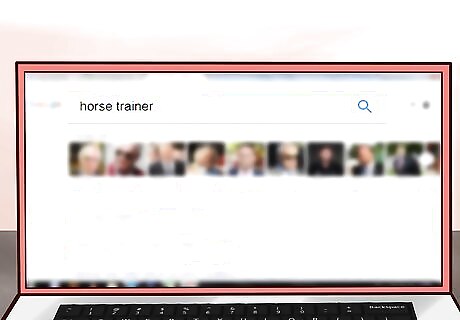 Search for a horse trainer online. Spend some time browsing the internet for horse trainers that are available in your area. Read through their website details so you can gather as much information about them as possible before you make contact. Check the trainer's qualifications, experience, and testimonials from current clients.
