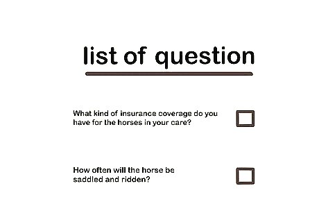 Make sure the trainer has insurance coverage. Check to make sure potential trainers are insured to cover any injuries that occur during training. At the very least, potential trainers should have care, custody, and control (CCC) insurance which will cover your horse in case of injury or death while it is in the trainer's care. You can feel free to ask trainers about their insurance policies, and even call the insurance company to make sure their policies are current.